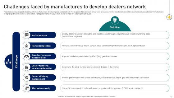 This slide covers pain points faced by auto manufacturers in developing dealership network. The purpose of this template is to provide an overview on the solutions that would reduce hurdles in operations of manufacturers comprising of market analysis, competition, brand performance measurement, dealer number and location optimization, etc. Get a simple yet stunning designed Ultimate Guide To Developing Challenges Faced By Manufactures To Develop Dealers Network Strategy SS V. It is the best one to establish the tone in your meetings. It is an excellent way to make your presentations highly effective. So, download this PPT today from Slidegeeks and see the positive impacts. Our easy-to-edit Ultimate Guide To Developing Challenges Faced By Manufactures To Develop Dealers Network Strategy SS V can be your go-to option for all upcoming conferences and meetings. So, what are you waiting for Grab this template today. This slide covers pain points faced by auto manufacturers in developing dealership network. The purpose of this template is to provide an overview on the solutions that would reduce hurdles in operations of manufacturers comprising of market analysis, competition, brand performance measurement, dealer number and location optimization, etc.