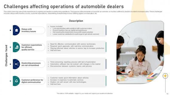 This slide covers top pain points experiences by agents and dealers in performing operations. The purpose of this template is to provide an overview on hurdles suffered by dealers in order to increase sales. These challenges includes delays with inventory issues, customer expectations, streamlining of dealership process, fulfilling digital communication, etc. Do you have to make sure that everyone on your team knows about any specific topic I yes, then you should give Ultimate Guide To Developing Challenges Affecting Operations Of Automobile Dealers Strategy SS V a try. Our experts have put a lot of knowledge and effort into creating this impeccable Ultimate Guide To Developing Challenges Affecting Operations Of Automobile Dealers Strategy SS V. You can use this template for your upcoming presentations, as the slides are perfect to represent even the tiniest detail. You can download these templates from the Slidegeeks website and these are easy to edit. So grab these today This slide covers top pain points experiences by agents and dealers in performing operations. The purpose of this template is to provide an overview on hurdles suffered by dealers in order to increase sales. These challenges includes delays with inventory issues, customer expectations, streamlining of dealership process, fulfilling digital communication, etc.