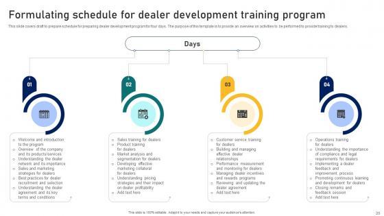 This slide covers draft to prepare schedule for preparing dealer development program for four days. The purpose of this template is to provide an overview on activities to be performed to provide training to dealers. Whether you have daily or monthly meetings, a brilliant presentation is necessary. Ultimate Guide To Developing Formulating Schedule For Dealer Development Training Program Strategy SS V can be your best option for delivering a presentation. Represent everything in detail using Ultimate Guide To Developing Formulating Schedule For Dealer Development Training Program Strategy SS V and make yourself stand out in meetings. The template is versatile and follows a structure that will cater to your requirements. All the templates prepared by Slidegeeks are easy to download and edit. Our research experts have taken care of the corporate themes as well. So, give it a try and see the results. This slide covers draft to prepare schedule for preparing dealer development program for four days. The purpose of this template is to provide an overview on activities to be performed to provide training to dealers.