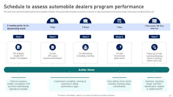 This slide covers automobile dealers performance evaluation schedule. The purpose of this template is to provide an overview on steps beginning from pre-analysis of data, customizing consulting and training, etc. Want to ace your presentation in front of a live audience Our Ultimate Guide To Developing Schedule To Assess Automobile Dealers Program Strategy SS V can help you do that by engaging all the users towards you. Slidegeeks experts have put their efforts and expertise into creating these impeccable powerpoint presentations so that you can communicate your ideas clearly. Moreover, all the templates are customizable, and easy-to-edit and downloadable. Use these for both personal and commercial use. This slide covers automobile dealers performance evaluation schedule. The purpose of this template is to provide an overview on steps beginning from pre-analysis of data, customizing consulting and training, etc.