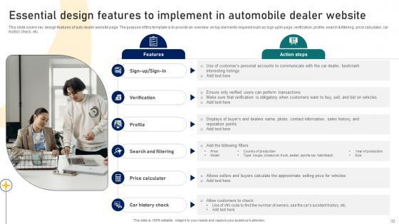 This slide covers key design features of auto dealer website page. The purpose of this template is to provide an overview on top elements required such as sign up or in page, verification, profile, search and filtering, price calculator, car history check, etc. Do you have an important presentation coming up Are you looking for something that will make your presentation stand out from the rest Look no further than Ultimate Guide To Developing Essential Design Features To Implement In Automobile Dealer Strategy SS V. With our professional designs, you can trust that your presentation will pop and make delivering it a smooth process. And with Slidegeeks, you can trust that your presentation will be unique and memorable. So why wait Grab Ultimate Guide To Developing Essential Design Features To Implement In Automobile Dealer Strategy SS V today and make your presentation stand out from the rest This slide covers key design features of auto dealer website page. The purpose of this template is to provide an overview on top elements required such as sign up or in page, verification, profile, search and filtering, price calculator, car history check, etc.