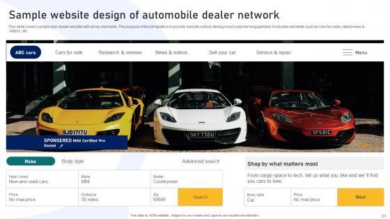 This slide covers sample auto dealer website with all key elements. The purpose of this template is to provide website outlook driving most customer engagement. It includes elements such as cars for sales, latest news and videos, etc. Slidegeeks is one of the best resources for PowerPoint templates. You can download easily and regulate Ultimate Guide To Developing Sample Website Design Of Automobile Dealer Network Strategy SS V for your personal presentations from our wonderful collection. A few clicks is all it takes to discover and get the most relevant and appropriate templates. Use our Templates to add a unique zing and appeal to your presentation and meetings. All the slides are easy to edit and you can use them even for advertisement purposes. This slide covers sample auto dealer website with all key elements. The purpose of this template is to provide website outlook driving most customer engagement. It includes elements such as cars for sales, latest news and videos, etc.