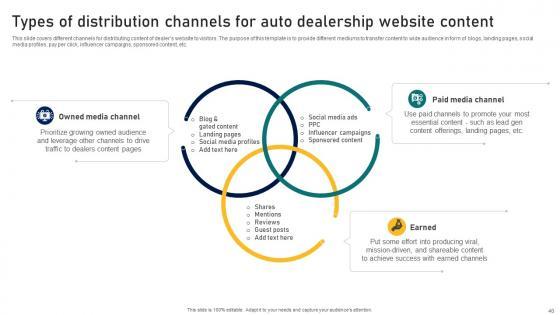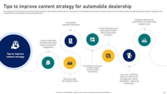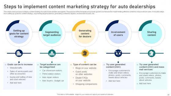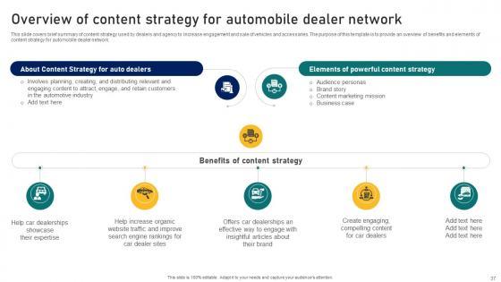 This slide covers brief summary of content strategy used by dealers and agency to increase engagement and sale of vehicles and accessories. The purpose of this template is to provide an overview of benefits and elements of content strategy for automobile dealer network. This Ultimate Guide To Developing Overview Of Content Strategy For Automobile Dealer Strategy SS V from Slidegeeks makes it easy to present information on your topic with precision. It provides customization options, so you can make changes to the colors, design, graphics, or any other component to create a unique layout. It is also available for immediate download, so you can begin using it right away. Slidegeeks has done good research to ensure that you have everything you need to make your presentation stand out. Make a name out there for a brilliant performance. This slide covers brief summary of content strategy used by dealers and agency to increase engagement and sale of vehicles and accessories. The purpose of this template is to provide an overview of benefits and elements of content strategy for automobile dealer network.