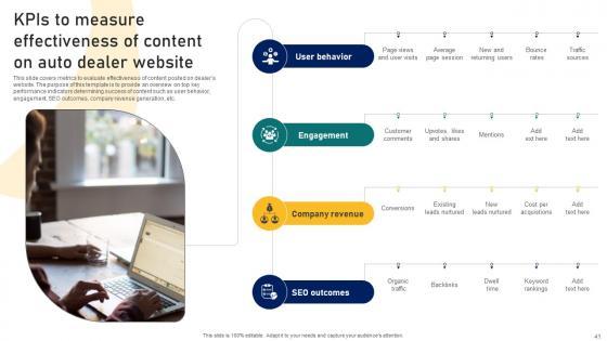 This slide covers metrics to evaluate effectiveness of content posted on dealers website. The purpose of this template is to provide an overview on top key performance indicators determining success of content such as user behavior, engagement, SEO outcomes, company revenue generation, etc. The Ultimate Guide To Developing Kpis To Measure Effectiveness Of Content On Auto Dealer Strategy SS V is a compilation of the most recent design trends as a series of slides. It is suitable for any subject or industry presentation, containing attractive visuals and photo spots for businesses to clearly express their messages. This template contains a variety of slides for the user to input data, such as structures to contrast two elements, bullet points, and slides for written information. Slidegeeks is prepared to create an impression. This slide covers metrics to evaluate effectiveness of content posted on dealers website. The purpose of this template is to provide an overview on top key performance indicators determining success of content such as user behavior, engagement, SEO outcomes, company revenue generation, etc.