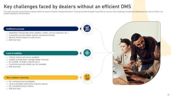 This slide covers top barriers faced by dealers network in absence of dealer management system. The purpose of this template is to provide an overview of top challenges comprising of inefficient process, lack of visibility, non existent reporting for vehicle dealers. Welcome to our selection of the Ultimate Guide To Developing Key Challenges Faced By Dealers Without An Efficient Strategy SS V. These are designed to help you showcase your creativity and bring your sphere to life. Planning and Innovation are essential for any business that is just starting out. This collection contains the designs that you need for your everyday presentations. All of our PowerPoints are 100Percent editable, so you can customize them to suit your needs. This multi-purpose template can be used in various situations. Grab these presentation templates today. This slide covers top barriers faced by dealers network in absence of dealer management system. The purpose of this template is to provide an overview of top challenges comprising of inefficient process, lack of visibility, non existent reporting for vehicle dealers.