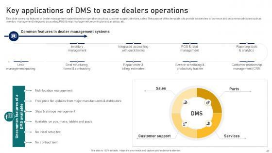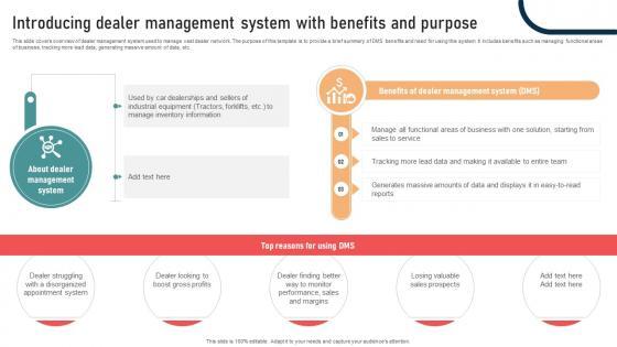 This slide covers overview of dealer management system used to manage vast dealer network. The purpose of this template is to provide a brief summary of DMS benefits and need for using this system. It includes benefits such as managing functional areas of business, tracking more lead data, generating massive amount of data, etc. Coming up with a presentation necessitates that the majority of the effort goes into the content and the message you intend to convey. The visuals of a PowerPoint presentation can only be effective if it supplements and supports the story that is being told. Keeping this in mind our experts created Ultimate Guide To Developing Introducing Dealer Management System With Benefits Strategy SS V to reduce the time that goes into designing the presentation. This way, you can concentrate on the message while our designers take care of providing you with the right template for the situation. This slide covers overview of dealer management system used to manage vast dealer network. The purpose of this template is to provide a brief summary of DMS benefits and need for using this system. It includes benefits such as managing functional areas of business, tracking more lead data, generating massive amount of data, etc.
