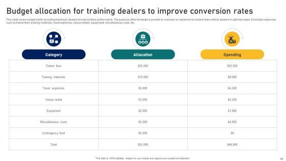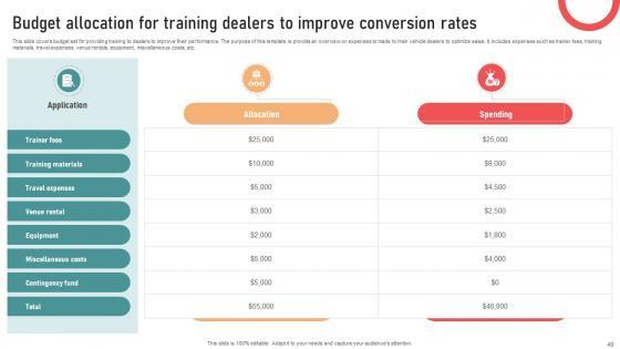 This slide covers budget set for providing training to dealers to improve their performance. The purpose of this template is provide an overview on expenses to made to train vehicle dealers to optimize sales. It includes expenses such as trainer fees, training materials, travel expenses, venue rentals, equipment, miscellaneous costs, etc. Want to ace your presentation in front of a live audience Our Ultimate Guide To Developing Budget Allocation For Training Dealers To Improve Conversion Strategy SS V can help you do that by engaging all the users towards you. Slidegeeks experts have put their efforts and expertise into creating these impeccable powerpoint presentations so that you can communicate your ideas clearly. Moreover, all the templates are customizable, and easy-to-edit and downloadable. Use these for both personal and commercial use. This slide covers budget set for providing training to dealers to improve their performance. The purpose of this template is provide an overview on expenses to made to train vehicle dealers to optimize sales. It includes expenses such as trainer fees, training materials, travel expenses, venue rentals, equipment, miscellaneous costs, etc.