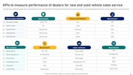 This slide covers metrics to evaluate dealers performance for new and used vehicle sales. The purpose of this template is to provide an overview on dealership profitability, benchmarks, gross contribution for new and old vehicles. From laying roadmaps to briefing everything in detail, our templates are perfect for you. You can set the stage with your presentation slides. All you have to do is download these easy-to-edit and customizable templates. Ultimate Guide To Developing A Kpis To Measure Performance Of Dealers For New Strategy SS V will help you deliver an outstanding performance that everyone would remember and praise you for. Do download this presentation today. This slide covers metrics to evaluate dealers performance for new and used vehicle sales. The purpose of this template is to provide an overview on dealership profitability, benchmarks, gross contribution for new and old vehicles.