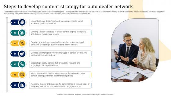 This slide covers process to draft content strategy for automobile dealers and agents. The purpose of this template is to provide guide to be followed for creating an effective content to induce vehicle sales. It includes steps from understanding auto dealers network, defining content objectives to create content, conducting research to understand, etc. There are so many reasons you need a Ultimate Guide To Developing Steps To Develop Content Strategy For Auto Dealer Strategy SS V. The first reason is you can not spend time making everything from scratch, Thus, Slidegeeks has made presentation templates for you too. You can easily download these templates from our website easily. This slide covers process to draft content strategy for automobile dealers and agents. The purpose of this template is to provide guide to be followed for creating an effective content to induce vehicle sales. It includes steps from understanding auto dealers network, defining content objectives to create content, conducting research to understand, etc.