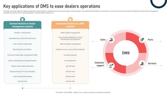 This slide covers top features of dealer management system based on operations such as customer support, services, sales. The purpose of this template is to provide an overview of common and uncommon attributes such as inventory management, integrated accounting, POS and retail management, reporting tools and analytics, etc. This Ultimate Guide To Developing Key Applications Of DMS To Ease Dealers Operations Strategy SS V is perfect for any presentation, be it in front of clients or colleagues. It is a versatile and stylish solution for organizing your meetings. The Ultimate Guide To Developing Key Applications Of DMS To Ease Dealers Operations Strategy SS V features a modern design for your presentation meetings. The adjustable and customizable slides provide unlimited possibilities for acing up your presentation. Slidegeeks has done all the homework before launching the product for you. So, do not wait, grab the presentation templates today This slide covers top features of dealer management system based on operations such as customer support, services, sales. The purpose of this template is to provide an overview of common and uncommon attributes such as inventory management, integrated accounting, POS and retail management, reporting tools and analytics, etc.