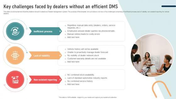 This slide covers top barriers faced by dealers network in absence of dealer management system. The purpose of this template is to provide an overview of top challenges comprising of inefficient process, lack of visibility, non existent reporting for vehicle dealers. Welcome to our selection of the Ultimate Guide To Developing Key Challenges Faced By Dealers Without An Efficient Strategy SS V. These are designed to help you showcase your creativity and bring your sphere to life. Planning and Innovation are essential for any business that is just starting out. This collection contains the designs that you need for your everyday presentations. All of our PowerPoints are 100Percent editable, so you can customize them to suit your needs. This multi-purpose template can be used in various situations. Grab these presentation templates today. This slide covers top barriers faced by dealers network in absence of dealer management system. The purpose of this template is to provide an overview of top challenges comprising of inefficient process, lack of visibility, non existent reporting for vehicle dealers.