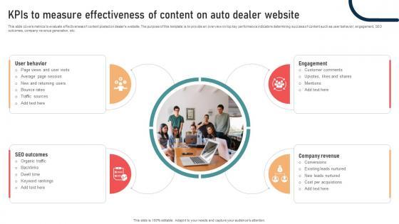 This slide covers metrics to evaluate effectiveness of content posted on dealers website. The purpose of this template is to provide an overview on top key performance indicators determining success of content such as user behavior, engagement, SEO outcomes, company revenue generation, etc. The Ultimate Guide To Developing Kpis To Measure Effectiveness Of Content On Auto Dealer Strategy SS V is a compilation of the most recent design trends as a series of slides. It is suitable for any subject or industry presentation, containing attractive visuals and photo spots for businesses to clearly express their messages. This template contains a variety of slides for the user to input data, such as structures to contrast two elements, bullet points, and slides for written information. Slidegeeks is prepared to create an impression. This slide covers metrics to evaluate effectiveness of content posted on dealers website. The purpose of this template is to provide an overview on top key performance indicators determining success of content such as user behavior, engagement, SEO outcomes, company revenue generation, etc.