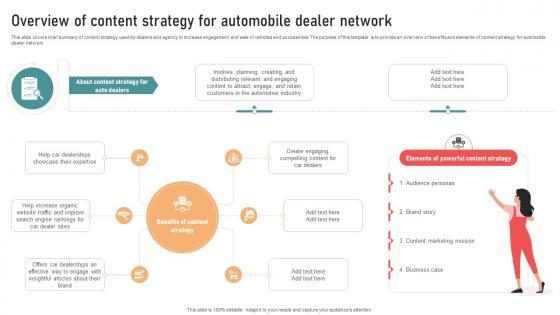 This slide covers brief summary of content strategy used by dealers and agency to increase engagement and sale of vehicles and accessories. The purpose of this template is to provide an overview of benefits and elements of content strategy for automobile dealer network. This Ultimate Guide To Developing Overview Of Content Strategy For Automobile Dealer Strategy SS V from Slidegeeks makes it easy to present information on your topic with precision. It provides customization options, so you can make changes to the colors, design, graphics, or any other component to create a unique layout. It is also available for immediate download, so you can begin using it right away. Slidegeeks has done good research to ensure that you have everything you need to make your presentation stand out. Make a name out there for a brilliant performance. This slide covers brief summary of content strategy used by dealers and agency to increase engagement and sale of vehicles and accessories. The purpose of this template is to provide an overview of benefits and elements of content strategy for automobile dealer network.