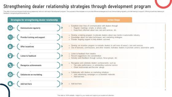 This slide covers techniques to build strong dealership network with help of development program. The purpose of this template is to provide different strategies such as communicating regularly, provide training and support, offering incentives, listening to feedback, recognizing achievements, etc. Get a simple yet stunning designed Ultimate Guide To Developing Strengthening Dealer Relationship Strategies Through Strategy SS V. It is the best one to establish the tone in your meetings. It is an excellent way to make your presentations highly effective. So, download this PPT today from Slidegeeks and see the positive impacts. Our easy-to-edit Ultimate Guide To Developing Strengthening Dealer Relationship Strategies Through Strategy SS V can be your go-to option for all upcoming conferences and meetings. So, what are you waiting for Grab this template today. This slide covers techniques to build strong dealership network with help of development program. The purpose of this template is to provide different strategies such as communicating regularly, provide training and support, offering incentives, listening to feedback, recognizing achievements, etc.