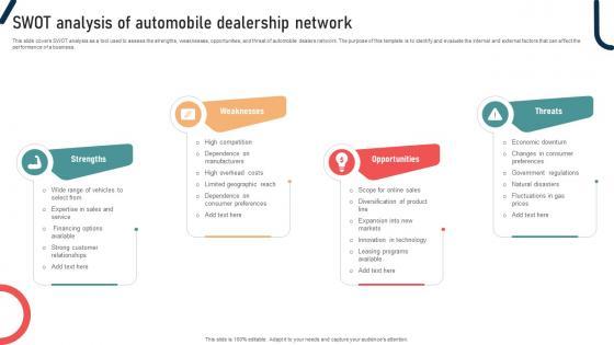 This slide covers SWOT analysis as a tool used to assess the strengths, weaknesses, opportunities, and threat of automobile dealers network. The purpose of this template is to identify and evaluate the internal and external factors that can affect the performance of a business. From laying roadmaps to briefing everything in detail, our templates are perfect for you. You can set the stage with your presentation slides. All you have to do is download these easy-to-edit and customizable templates. Ultimate Guide To Developing Swot Analysis Of Automobile Dealership Network Strategy SS V will help you deliver an outstanding performance that everyone would remember and praise you for. Do download this presentation today. This slide covers SWOT analysis as a tool used to assess the strengths, weaknesses, opportunities, and threat of automobile dealers network. The purpose of this template is to identify and evaluate the internal and external factors that can affect the performance of a business.