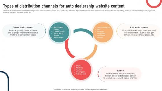 This slide covers different channels for distributing content of dealers website to visitors. The purpose of this template is to provide different mediums to transfer content to wide audience in form of blogs, landing pages, social media profiles, pay per click, influencer campaigns, sponsored content, etc. Slidegeeks is here to make your presentations a breeze with Ultimate Guide To Developing Types Of Distribution Channels For Auto Dealership Strategy SS V With our easy-to-use and customizable templates, you can focus on delivering your ideas rather than worrying about formatting. With a variety of designs to choose from, you are sure to find one that suits your needs. And with animations and unique photos, illustrations, and fonts, you can make your presentation pop. So whether you are giving a sales pitch or presenting to the board, make sure to check out Slidegeeks first This slide covers different channels for distributing content of dealers website to visitors. The purpose of this template is to provide different mediums to transfer content to wide audience in form of blogs, landing pages, social media profiles, pay per click, influencer campaigns, sponsored content, etc.