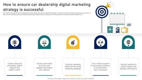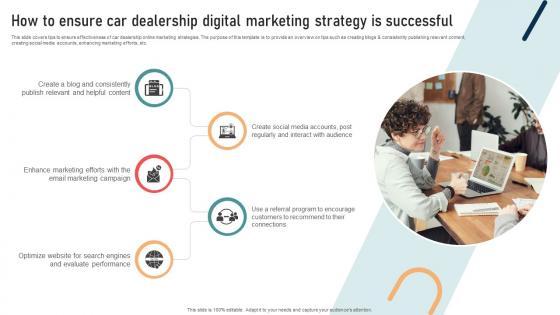 This slide covers tips to ensure effectiveness of car dealership online marketing strategies. The purpose of this template is to provide an overview on tips such as creating blogs and consistently publishing relevant content, creating social media accounts, enhancing marketing efforts, etc. If your project calls for a presentation, then Slidegeeks is your go-to partner because we have professionally designed, easy-to-edit templates that are perfect for any presentation. After downloading, you can easily edit Guide To Building A Successful How To Ensure Car Dealership Digital Marketing Strategy SS V and make the changes accordingly. You can rearrange slides or fill them with different images. Check out all the handy templates This slide covers tips to ensure effectiveness of car dealership online marketing strategies. The purpose of this template is to provide an overview on tips such as creating blogs and consistently publishing relevant content, creating social media accounts, enhancing marketing efforts, etc.