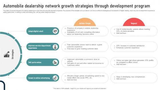 This slide covers techniques to for helping dealers grow their network using development programs. The purpose of this template is to provide an overview on different strategies such as adoption of digital retailing, improving service department experience, selling parts online, investing in online advertising, etc. with key action steps and impact. Create an editable Guide To Building A Successful Automobile Dealership Network Growth Strategies Through Strategy SS V that communicates your idea and engages your audience. Whether you are presenting a business or an educational presentation, pre-designed presentation templates help save time. Guide To Building A Successful Automobile Dealership Network Growth Strategies Through Strategy SS V is highly customizable and very easy to edit, covering many different styles from creative to business presentations. Slidegeeks has creative team members who have crafted amazing templates. So, go and get them without any delay. This slide covers techniques to for helping dealers grow their network using development programs. The purpose of this template is to provide an overview on different strategies such as adoption of digital retailing, improving service department experience, selling parts online, investing in online advertising, etc. with key action steps and impact.