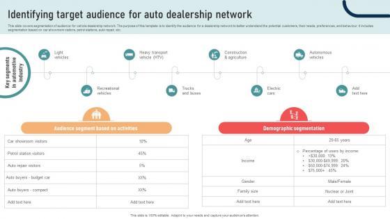 This slide covers segmentation of audience for vehicle dealership network. The purpose of this template is to identify the audience for a dealership network to better understand the potential customers, their needs, preferences, and behaviour. It includes segmentation based on car showroom visitors, petrol stations, auto repair, etc. If you are looking for a format to display your unique thoughts, then the professionally designed Ultimate Guide To Developing Identifying Target Audience For Auto Dealership Network Strategy SS V is the one for you. You can use it as a Google Slides template or a PowerPoint template. Incorporate impressive visuals, symbols, images, and other charts. Modify or reorganize the text boxes as you desire. Experiment with shade schemes and font pairings. Alter, share or cooperate with other people on your work. Download Ultimate Guide To Developing Identifying Target Audience For Auto Dealership Network Strategy SS V and find out how to give a successful presentation. Present a perfect display to your team and make your presentation unforgettable. This slide covers segmentation of audience for vehicle dealership network. The purpose of this template is to identify the audience for a dealership network to better understand the potential customers, their needs, preferences, and behaviour. It includes segmentation based on car showroom visitors, petrol stations, auto repair, etc.