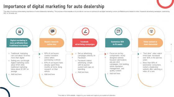 This slide covers key points stating importance of online dealership marketing. The purpose of this template is to provide an overview on points such as digital marketing is more profitable buyers research online, Facebook advertising campaigns, customizing SEO to fit needs, etc. Crafting an eye-catching presentation has never been more straightforward. Let your presentation shine with this tasteful yet straightforward Ultimate Guide To Developing Importance Of Digital Marketing For Auto Dealership Strategy SS V template. It offers a minimalistic and classy look that is great for making a statement. The colors have been employed intelligently to add a bit of playfulness while still remaining professional. Construct the ideal Ultimate Guide To Developing Importance Of Digital Marketing For Auto Dealership Strategy SS V that effortlessly grabs the attention of your audience Begin now and be certain to wow your customers This slide covers key points stating importance of online dealership marketing. The purpose of this template is to provide an overview on points such as digital marketing is more profitable buyers research online, Facebook advertising campaigns, customizing SEO to fit needs, etc.