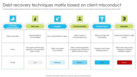 This slide consists of a strategy matrix and action plan which can be used to overcome the client misconduct while collecting the loan amount. Key elements covered are customer characteristics, client misconduct, action and priority. Pitch your topic with ease and precision using this Debt Recovery Techniques Matrix Based On Client Misconduct Graphics Pdf. This layout presents information on Debt Recovery Techniques Matrix, Client Misconduct, Communicator. It is also available for immediate download and adjustment. So, changes can be made in the color, design, graphics or any other component to create a unique layout. This slide consists of a strategy matrix and action plan which can be used to overcome the client misconduct while collecting the loan amount. Key elements covered are customer characteristics, client misconduct, action and priority.