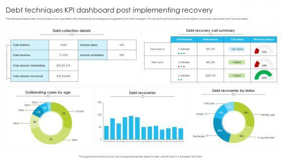 This dashboard depicts debt recovery status of an organization after implementing the strategies as suggested by the brand managers. The key performance indicators are total debtors, recoveries, call summary and recovery status. Showcasing this set of slides titled Debt Techniques KPI Dashboard Post Implementing Recovery Information Pdf. The topics addressed in these templates are Debt Techniques, KPI Dashboard, Post Implementing Recovery. All the content presented in this PPT design is completely editable. Download it and make adjustments in color, background, font etc. as per your unique business setting. This dashboard depicts debt recovery status of an organization after implementing the strategies as suggested by the brand managers. The key performance indicators are total debtors, recoveries, call summary and recovery status.