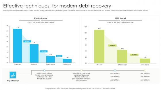 Following slide encompasses the analysis of email and SMS strategy which are used by brand managers to collect debts and brings forth the sent rate and click rate. The elements consist of sent, delivered, opened and clicked emails and SMS. Showcasing this set of slides titled Effective Techniques For Modern Debt Recovery Sample Pdf. The topics addressed in these templates are Effective Technique, Modern Debt Recovery, Opened And Clicked Emails. All the content presented in this PPT design is completely editable. Download it and make adjustments in color, background, font etc. as per your unique business setting. Following slide encompasses the analysis of email and SMS strategy which are used by brand managers to collect debts and brings forth the sent rate and click rate. The elements consist of sent, delivered, opened and clicked emails and SMS.