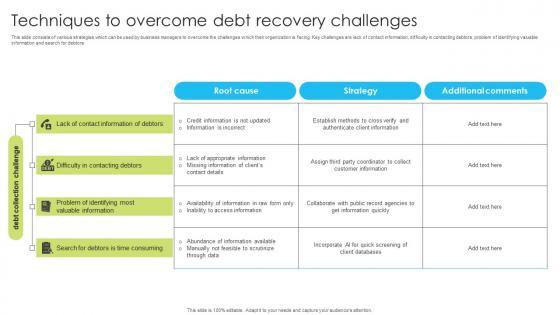 This slide consists of various strategies which can be used by business managers to overcome the challenges which their organization is facing. Key challenges are lack of contact information, difficulty in contacting debtors, problem of identifying valuable information and search for debtors. Pitch your topic with ease and precision using this Techniques To Overcome Debt Recovery Challenges Download Pdf. This layout presents information on Contact Information Of Debtors, Valuable Information, Debtors Is Time Consuming. It is also available for immediate download and adjustment. So, changes can be made in the color, design, graphics or any other component to create a unique layout. This slide consists of various strategies which can be used by business managers to overcome the challenges which their organization is facing. Key challenges are lack of contact information, difficulty in contacting debtors, problem of identifying valuable information and search for debtors.