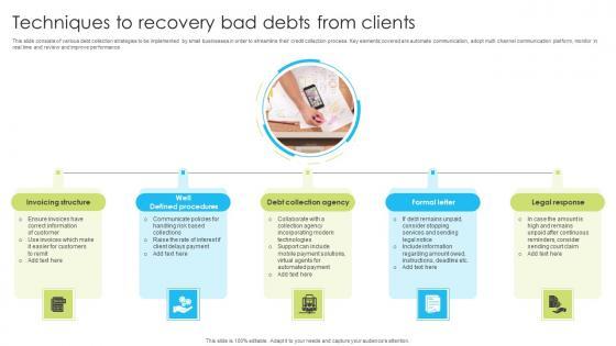 This slide consists of various debt collection strategies to be implemented by small businesses in order to streamline their credit collection process. Key elements covered are automate communication, adopt multi channel communication platform, monitor in real time and review and improve performance. Showcasing this set of slides titled Techniques To Recovery Bad Debts From Clients Demonstration Pdf. The topics addressed in these templates are Invoicing Structure, Debt Collection Agency, Legal Response, Bad Debts From Clients. All the content presented in this PPT design is completely editable. Download it and make adjustments in color, background, font etc. as per your unique business setting. This slide consists of various debt collection strategies to be implemented by small businesses in order to streamline their credit collection process. Key elements covered are automate communication, adopt multi channel communication platform, monitor in real time and review and improve performance.