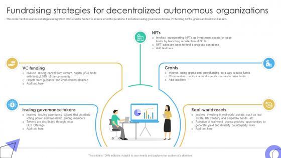 This slide mentions various strategies using which DAOs can be funded to ensure smooth operations. It includes issuing governance tokens, VC funding, NFTs, grants and real world assets. If your project calls for a presentation, then Slidegeeks is your go-to partner because we have professionally designed, easy-to-edit templates that are perfect for any presentation. After downloading, you can easily edit Guide To Understanding Decentralized Fundraising Strategies For Decentralized Autonomous BCT SS V and make the changes accordingly. You can rearrange slides or fill them with different images. Check out all the handy templates This slide mentions various strategies using which DAOs can be funded to ensure smooth operations. It includes issuing governance tokens, VC funding, NFTs, grants and real world assets.