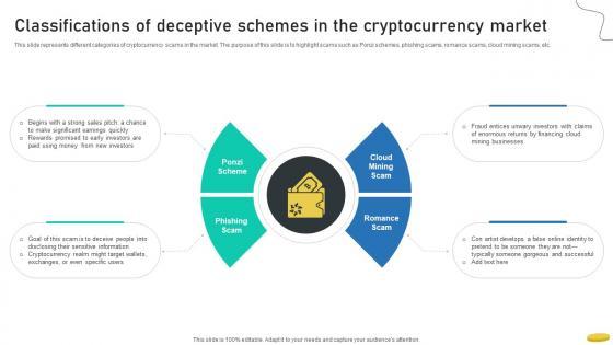 This slide represents different categories of cryptocurrency scams in the market. The purpose of this slide is to highlight scams such as Ponzi schemes, phishing scams, romance scams, cloud mining scams, etc.Find highly impressive Classifications Of Deceptive Schemes In The Cryptocurrency Management With Blockchain on Slidegeeks to deliver a meaningful presentation. You can save an ample amount of time using these presentation templates. No need to worry to prepare everything from scratch because Slidegeeks experts have already done a huge research and work for you. You need to download Classifications Of Deceptive Schemes In The Cryptocurrency Management With Blockchain for your upcoming presentation. All the presentation templates are 100 percent editable and you can change the color and personalize the content accordingly. Download now This slide represents different categories of cryptocurrency scams in the market. The purpose of this slide is to highlight scams such as Ponzi schemes, phishing scams, romance scams, cloud mining scams, etc.
