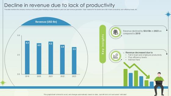 This slide mentions the company revenue of the past years indicating a major decline in year over year revenue generation. Major reasons for the decline are a fall in team productivity, poor efficiency levels, etc. Slidegeeks is here to make your presentations a breeze with Decline In Revenue Due To Lack Of Productivity Business Growth Ppt Powerpoint With our easy-to-use and customizable templates, you can focus on delivering your ideas rather than worrying about formatting. With a variety of designs to choose from, you are sure to find one that suits your needs. And with animations and unique photos, illustrations, and fonts, you can make your presentation pop. So whether you are giving a sales pitch or presenting to the board, make sure to check out Slidegeeks first This slide mentions the company revenue of the past years indicating a major decline in year over year revenue generation. Major reasons for the decline are a fall in team productivity, poor efficiency levels, etc.