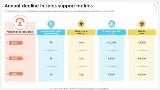 This slide highlights the decline in key sales enablement performance indicators including sales cycle length, sales closing rate, average deal size, and website traffic. Create an editable Business Development Team Annual Decline In Sales Support Metrics SA SS V that communicates your idea and engages your audience. Whether you are presenting a business or an educational presentation, pre-designed presentation templates help save time. Business Development Team Annual Decline In Sales Support Metrics SA SS V is highly customizable and very easy to edit, covering many different styles from creative to business presentations. Slidegeeks has creative team members who have crafted amazing templates. So, go and get them without any delay. This slide highlights the decline in key sales enablement performance indicators including sales cycle length, sales closing rate, average deal size, and website traffic.
