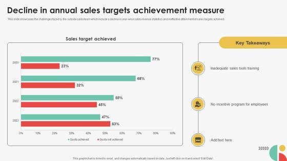 This slide showcases the challenges faced by the outside sales team which include a decline in year-wise sales revenue statistics and ineffective attainment of sales targets achieved.Slidegeeks is here to make your presentations a breeze with Decline In Annual Sales Targets Achievement Measure Tactics For Improving Field Sales Team SA SS V With our easy-to-use and customizable templates, you can focus on delivering your ideas rather than worrying about formatting. With a variety of designs to choose from, you are sure to find one that suits your needs. And with animations and unique photos, illustrations, and fonts, you can make your presentation pop. So whether you are giving a sales pitch or presenting to the board, make sure to check out Slidegeeks first This slide showcases the challenges faced by the outside sales team which include a decline in year-wise sales revenue statistics and ineffective attainment of sales targets achieved.