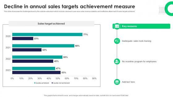This slide showcases the challenges faced by the outside sales team which include a decline in year-wise sales revenue statistics and ineffective attainment of sales targets achieved. Slidegeeks is here to make your presentations a breeze with Decline In Annual Sales Targets Achievement Efficient Sales Territory Management To Build SA SS V With our easy-to-use and customizable templates, you can focus on delivering your ideas rather than worrying about formatting. With a variety of designs to choose from, you are sure to find one that suits your needs. And with animations and unique photos, illustrations, and fonts, you can make your presentation pop. So whether you are giving a sales pitch or presenting to the board, make sure to check out Slidegeeks first This slide showcases the challenges faced by the outside sales team which include a decline in year-wise sales revenue statistics and ineffective attainment of sales targets achieved.