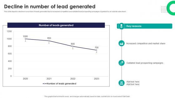 This slide depicts a decline in a number of leads generated due to increased competition and outdated lead prospecting campaigns organized by an outside sales team. Do you have an important presentation coming up Are you looking for something that will make your presentation stand out from the rest Look no further than Decline In Number Of Lead Generated Efficient Sales Territory Management To Build SA SS V. With our professional designs, you can trust that your presentation will pop and make delivering it a smooth process. And with Slidegeeks, you can trust that your presentation will be unique and memorable. So why wait Grab Decline In Number Of Lead Generated Efficient Sales Territory Management To Build SA SS V today and make your presentation stand out from the rest This slide depicts a decline in a number of leads generated due to increased competition and outdated lead prospecting campaigns organized by an outside sales team.