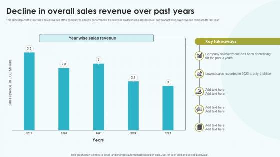 This slide depicts the year-wise sales revenue of the company to analyze performance. It showcases a decline in sales revenue, and product-wise sales revenue compared to last year. Slidegeeks is here to make your presentations a breeze with Elevating Sales Networks Decline In Overall Sales Revenue Over Past Years SA SS V With our easy-to-use and customizable templates, you can focus on delivering your ideas rather than worrying about formatting. With a variety of designs to choose from, you are sure to find one that suits your needs. And with animations and unique photos, illustrations, and fonts, you can make your presentation pop. So whether you are giving a sales pitch or presenting to the board, make sure to check out Slidegeeks first This slide depicts the year-wise sales revenue of the company to analyze performance. It showcases a decline in sales revenue, and product-wise sales revenue compared to last year.