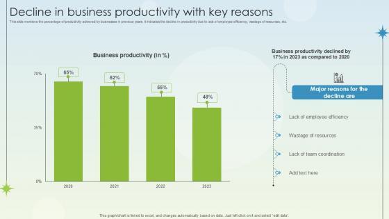 This slide mentions the percentage of productivity achieved by businesses in previous years. it indicates the decline in productivity due to lack of employee efficiency, wastage of resources, etc. Present like a pro with Decline In Business Productivity With Key Reasons Business Growth Ppt Slides. Create beautiful presentations together with your team, using our easy-to-use presentation slides. Share your ideas in real-time and make changes on the fly by downloading our templates. So whether you are in the office, on the go, or in a remote location, you can stay in sync with your team and present your ideas with confidence. With Slidegeeks presentation got a whole lot easier. Grab these presentations today. This slide mentions the percentage of productivity achieved by businesses in previous years. it indicates the decline in productivity due to lack of employee efficiency, wastage of resources, etc.