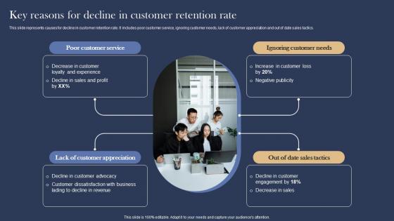 This slide represents causes for decline in customer retention rate. It includes poor customer service, ignoring customer needs, lack of customer appreciation and out of date sales tactics. The best PPT templates are a great way to save time, energy, and resources. Slidegeeks have 100 percent editable powerpoint slides making them incredibly versatile. With these quality presentation templates, you can create a captivating and memorable presentation by combining visually appealing slides and effectively communicating your message. Download Key Reasons Decline Customer Management And Marketing Strategies For E Commerce Inspiration Pdf from Slidegeeks and deliver a wonderful presentation. This slide represents causes for decline in customer retention rate. It includes poor customer service, ignoring customer needs, lack of customer appreciation and out of date sales tactics.