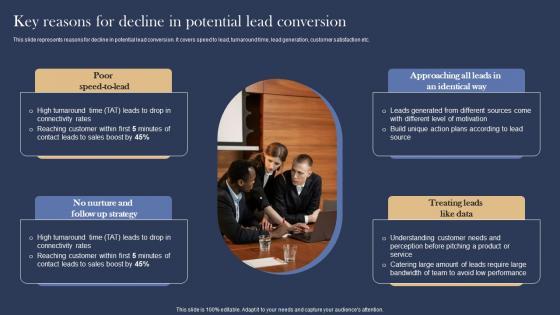 This slide represents reasons for decline in potential lead conversion. It covers speed to lead, turnaround time, lead generation, customer satisfaction etc.Whether you have daily or monthly meetings, a brilliant presentation is necessary. Key Reasons For Decline In Potential Lead Conversion Ecommerce Marketing Plan To Enhance Rules PDF can be your best option for delivering a presentation. Represent everything in detail using Key Reasons For Decline In Potential Lead Conversion Ecommerce Marketing Plan To Enhance Rules PDF and make yourself stand out in meetings. The template is versatile and follows a structure that will cater to your requirements. All the templates prepared by Slidegeeks are easy to download and edit. Our research experts have taken care of the corporate themes as well. So, give it a try and see the results.