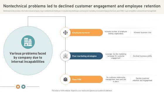 Mentioned slide provides information about company major nontechnical challenges. It includes key challenges such as poor marketing, increased employee turnover, poor CRM, huge competition, and workload management. From laying roadmaps to briefing everything in detail, our templates are perfect for you. You can set the stage with your presentation slides. All you have to do is download these easy-to-edit and customizable templates. Comprehensive Guide For Website Nontechnical Problems Led To Declined Customer will help you deliver an outstanding performance that everyone would remember and praise you for. Do download this presentation today. Mentioned slide provides information about company major nontechnical challenges. It includes key challenges such as poor marketing, increased employee turnover, poor CRM, huge competition, and workload management.