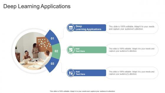 Introducing our well-designed Deep Learning Applications In Powerpoint And Google Slides Cpb. This PowerPoint design presents information on topics like Deep Learning Applications. As it is predesigned it helps boost your confidence level. It also makes you a better presenter because of its high-quality content and graphics. This PPT layout can be downloaded and used in different formats like PDF, PNG, and JPG. Not only this, it is available in both Standard Screen and Widescreen aspect ratios for your convenience. Therefore, click on the download button now to persuade and impress your audience. Our Deep Learning Applications In Powerpoint And Google Slides Cpb are topically designed to provide an attractive backdrop to any subject. Use them to look like a presentation pro.