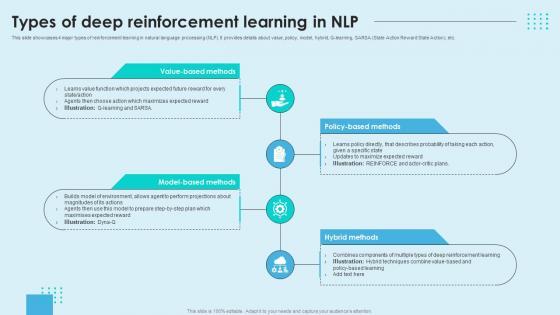 This slide showcases 4 major types of reinforcement learning in natural language processing NLP . It provides details about value, policy, model, hybrid, Q-learning, SARSA State Action Reward State Action, etc. Find a pre-designed and impeccable Reinforcement Learning Unveiled Types Of Deep Reinforcement Learning In NLP AI SS V. The templates can ace your presentation without additional effort. You can download these easy-to-edit presentation templates to make your presentation stand out from others. So, what are you waiting for Download the template from Slidegeeks today and give a unique touch to your presentation. This slide showcases 4 major types of reinforcement learning in natural language processing NLP . It provides details about value, policy, model, hybrid, Q-learning, SARSA State Action Reward State Action, etc.