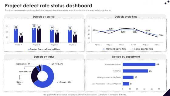 This slide shows dashboard related to overall defects in the organization while completing project. It includes defects by project, defects cycle time, etc. Slidegeeks is here to make your presentations a breeze with Project Defect Rate Status Dashboard Lean Six Sigma In Manufacturing Ppt Sample With our easy-to-use and customizable templates, you can focus on delivering your ideas rather than worrying about formatting. With a variety of designs to choose from, you are sure to find one that suits your needs. And with animations and unique photos, illustrations, and fonts, you can make your presentation pop. So whether you are giving a sales pitch or presenting to the board, make sure to check out Slidegeeks first This slide shows dashboard related to overall defects in the organization while completing project. It includes defects by project, defects cycle time, etc.