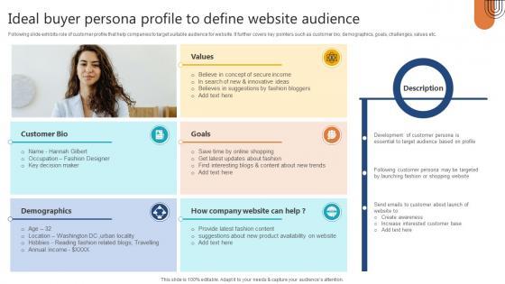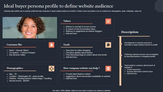 Following slide exhibits role of customer profile that help companies to target suitable audience for website. It further covers key pointers such as customer bio, demographics, goals, challenges, values etc. Make sure to capture your audiences attention in your business displays with our gratis customizable Complete Guide To Launch Ideal Buyer Persona Profile To Define Website Audience. These are great for business strategies, office conferences, capital raising or task suggestions. If you desire to acquire more customers for your tech business and ensure they stay satisfied, create your own sales presentation with these plain slides. Following slide exhibits role of customer profile that help companies to target suitable audience for website. It further covers key pointers such as customer bio, demographics, goals, challenges, values etc.