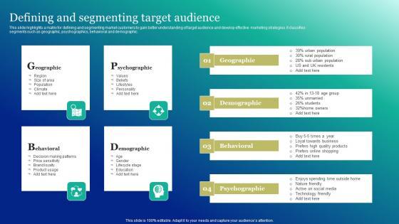 This slide highlights a matrix for defining and segmenting market customers to gain better understanding of target audience and develop effective marketing strategies. It classifies segments such as geographic, psychographics, behavioral and demographic. Get a simple yet stunning designed Comprehensive Guide To Build Marketing Strategy Defining And Segmenting Target Audience Ideas PDF. It is the best one to establish the tone in your meetings. It is an excellent way to make your presentations highly effective. So, download this PPT today from Slidegeeks and see the positive impacts. Our easy to edit Comprehensive Guide To Build Marketing Strategy Defining And Segmenting Target Audience Ideas PDF can be your go to option for all upcoming conferences and meetings. So, what are you waiting for Grab this template today.