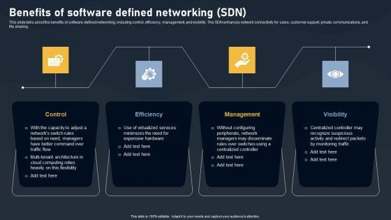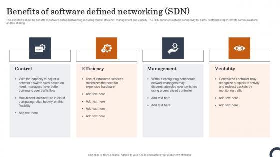 This slide talks about the benefits of software-defined networking, including control, efficiency, management, and visibility. The SDN enhances network connectivity for sales, customer support, private communications, and file sharing. Create an editable Software Defined Networking Development Strategies Benefits Of Software Defined Networking SDN Designs PDF that communicates your idea and engages your audience. Whether youre presenting a business or an educational presentation, pre designed presentation templates help save time. Software Defined Networking Development Strategies Benefits Of Software Defined Networking SDN Designs PDF is highly customizable and very easy to edit, covering many different styles from creative to business presentations. Slidegeeks has creative team members who have crafted amazing templates. So, go and get them without any delay.