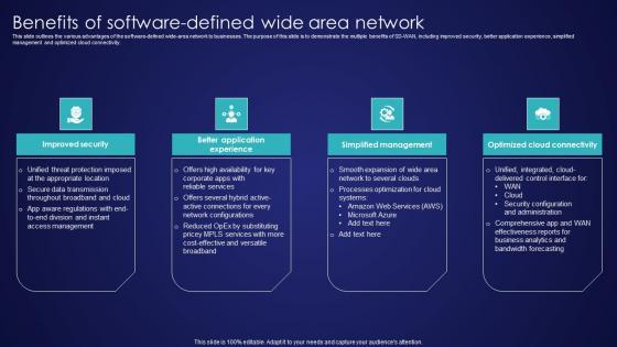 This slide outlines the various advantages of the software-defined wide-area network to businesses. The purpose of this slide is to demonstrate the multiple benefits of SD-WAN, including improved security, better application experience, simplified management and optimized cloud connectivity. Slidegeeks is one of the best resources for PowerPoint templates. You can download easily and regulate Benefits Of Software Defined Wide Area Network Wide Area Network Services Summary Pdf for your personal presentations from our wonderful collection. A few clicks is all it takes to discover and get the most relevant and appropriate templates. Use our Templates to add a unique zing and appeal to your presentation and meetings. All the slides are easy to edit and you can use them even for advertisement purposes. This slide outlines the various advantages of the software-defined wide-area network to businesses. The purpose of this slide is to demonstrate the multiple benefits of SD-WAN, including improved security, better application experience, simplified management and optimized cloud connectivity.
