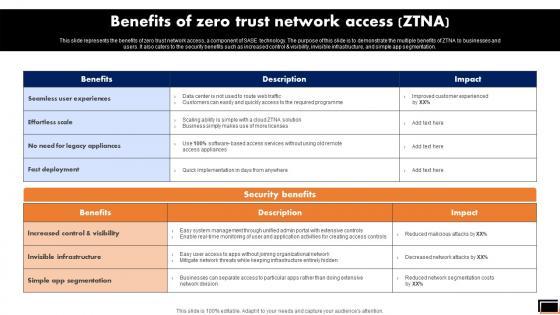 This slide represents the benefits of zero trust network access, a component of SASE technology. The purpose of this slide is to demonstrate the multiple benefits of ZTNA to businesses and users. It also caters to the security benefits such as increased control and visibility, invisible infrastructure, and simple app segmentation. Slidegeeks is one of the best resources for PowerPoint templates. You can download easily and regulate Benefits Of Zero Trust Network Access Ztna Software Defined Perimeter SDP for your personal presentations from our wonderful collection. A few clicks is all it takes to discover and get the most relevant and appropriate templates. Use our Templates to add a unique zing and appeal to your presentation and meetings. All the slides are easy to edit and you can use them even for advertisement purposes. This slide represents the benefits of zero trust network access, a component of SASE technology. The purpose of this slide is to demonstrate the multiple benefits of ZTNA to businesses and users. It also caters to the security benefits such as increased control and visibility, invisible infrastructure, and simple app segmentation.
