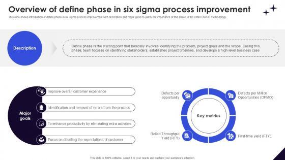 This slide shows introduction of define phase in six sigma process improvement with description and major goals to justify the importance of this phase in the entire DMAIC methodology. Retrieve professionally designed Overview Of Define Phase In DMAIC Methodology To Maintain PPT Template to effectively convey your message and captivate your listeners. Save time by selecting pre-made slideshows that are appropriate for various topics, from business to educational purposes. These themes come in many different styles, from creative to corporate, and all of them are easily adjustable and can be edited quickly. Access them as PowerPoint templates or as Google Slides themes. You do not have to go on a hunt for the perfect presentation because Slidegeeks got you covered from everywhere. This slide shows introduction of define phase in six sigma process improvement with description and major goals to justify the importance of this phase in the entire DMAIC methodology.